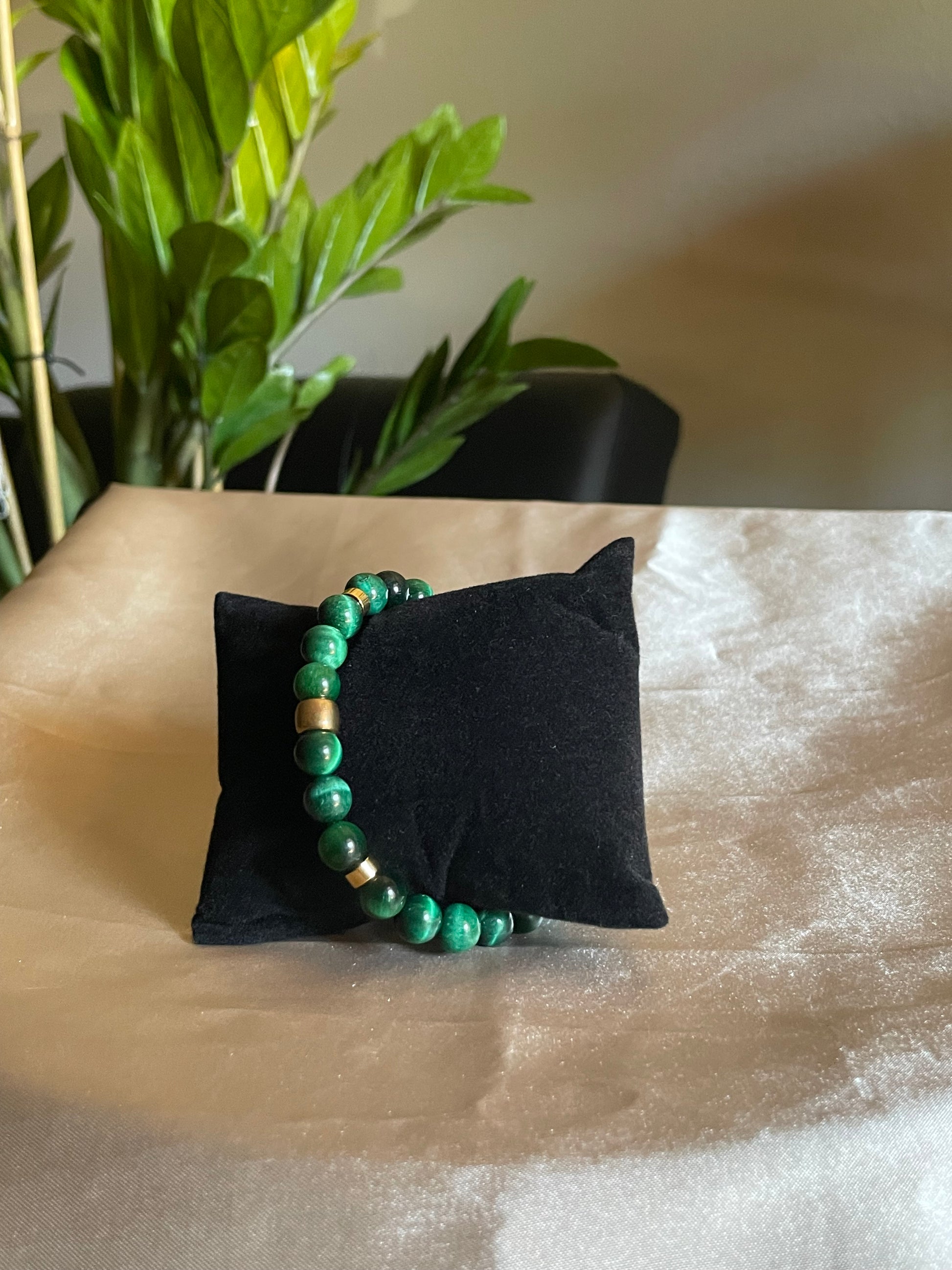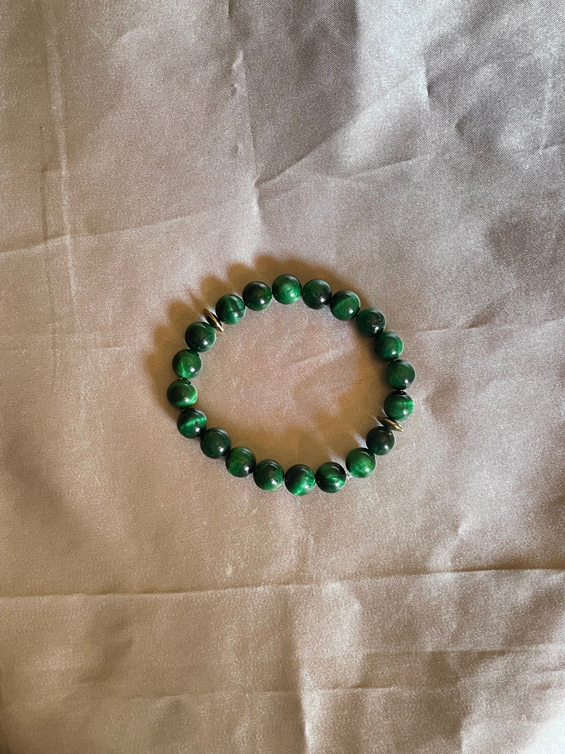 10mm Green Tiger’s Eye beads strung together by stretch cord for easy accessibility. Several gold accent beads. Just like the healing properties, this piece immediately gives strong, strength vibes. Commanding even.